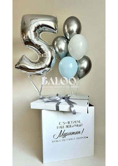 Состав набора: Коробка сюрприз с надписью Связка из 5 латексных шаров Цифра