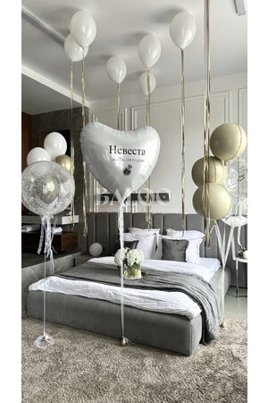 Набор шаров в белом и серебряном цвете с сердцем и большими шарами №2914