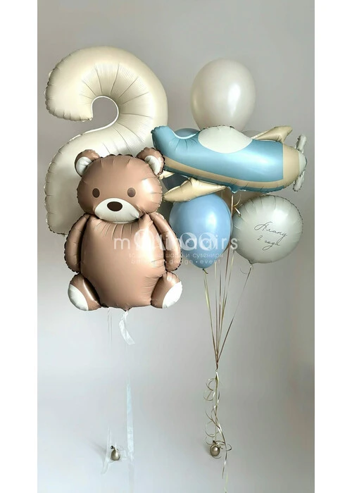 Состав набора: Фольгированная фигура Мишка Фольгированная фигура Самолет Связка из 5 латексных шаров и круга с надписью Цифра