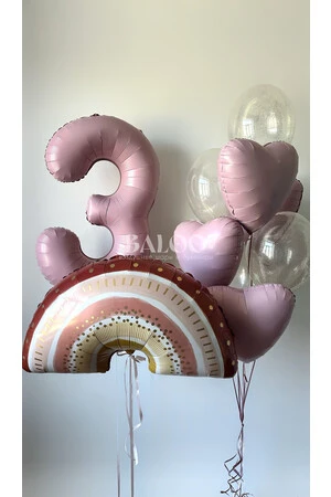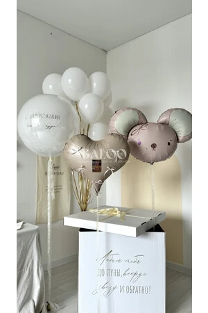 Набор шаров с мишкой, радугой и бежевой цифрой на подставке №2983