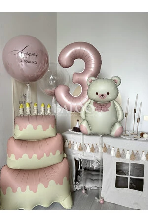 Набор с мишкой, цифрой, большим тортом и шаром с надписью для девочки №8228