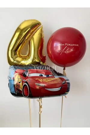 Набор гелиевых шаров мальчика с машиной и золотой цифрой №2014