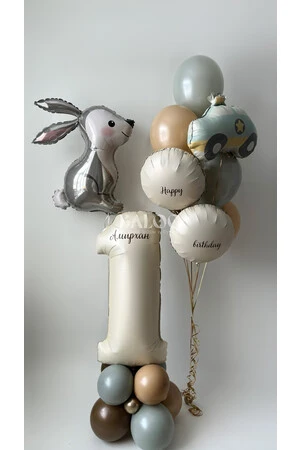 Набор гелиевых шаров с зайчиком и бежевой цифрой с именем на подставке №3109