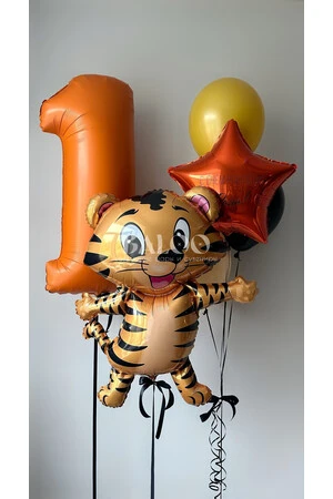 Набор гелиевых шаров с тигром и оранжевой цифрой на годик №3151