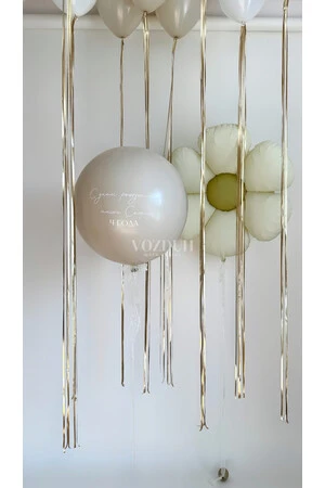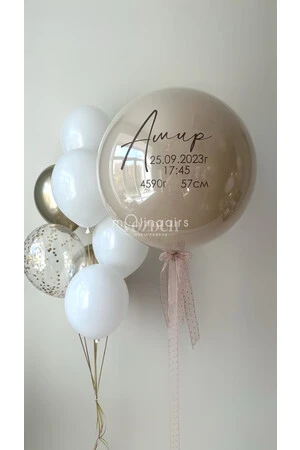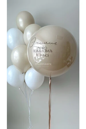 Набор гелиевых шаров бежевого и белого цвета с большим шаром на выписку №3240