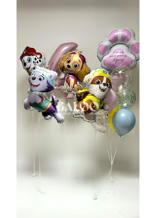 Состав набора: Фольгированная фигура Скай Фольгированная фигура Эверест Фольгированная фигура Крепыш Фольгированная фигура Маршал Связка из воздушных шаров 9 шт летексные и лапка фольгированная с надписью Цифра