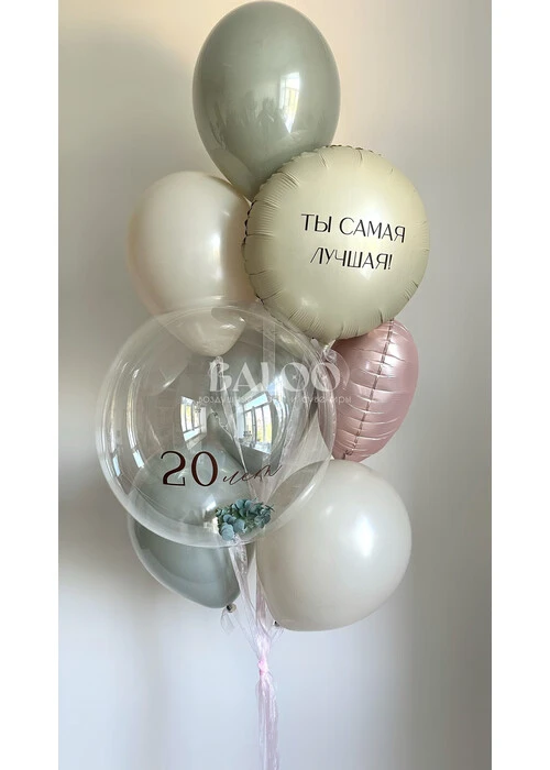 * Связка из 9 шаров: шар бабл с зеленью и надписью, 3 дабл-шара, 3 латексных шара, фольгированный круг с надписью, фольгированное сердце