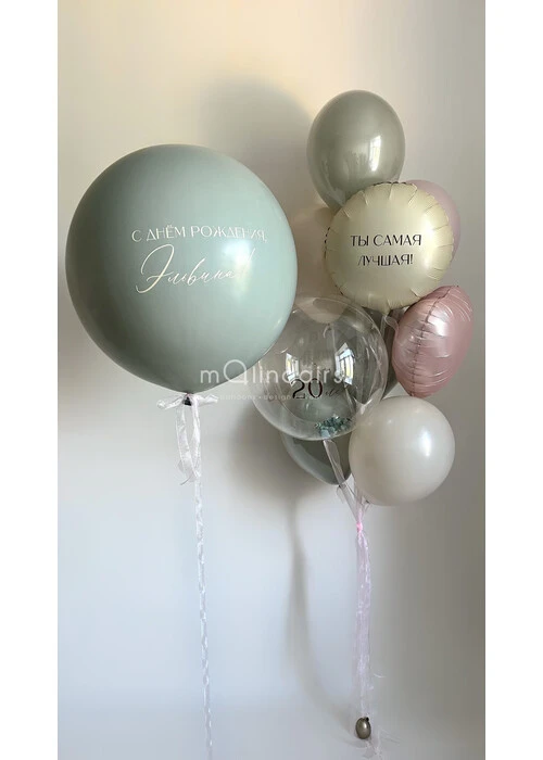 * Связка из 9 шаров: шар бабл с зеленью и надписью, 3 дабл-шара, 3 латексных шара, фольгированный круг с надписью, фольгированное сердце
