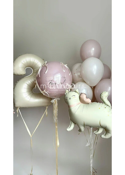 Состав набора: Фольгированная фигура Кошка с бантиком Латексный гелиевый шар 24 дюйма даблбабл с бантиками и надписью Связка из 7 латексных шаров Цифра