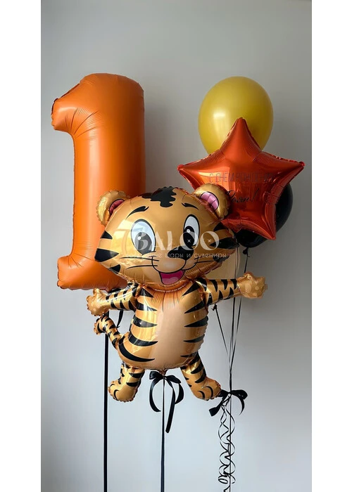 Набор гелиевых шаров с тигром и оранжевой цифрой на годик №3151