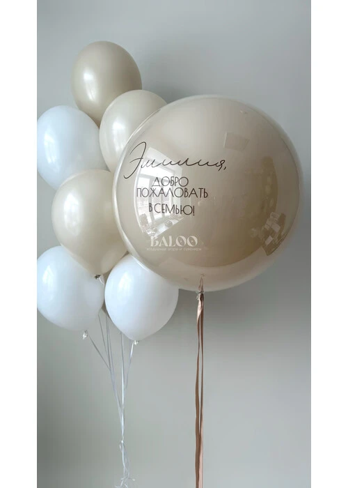 Набор гелиевых шаров бежевого и белого цвета с большим шаром на выписку №3240