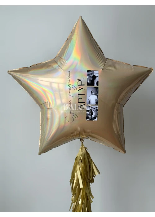 * Фольгированный гелиевый шар в виде золотой звезды с индивидуальной фотопечатью и надписью с дождиком