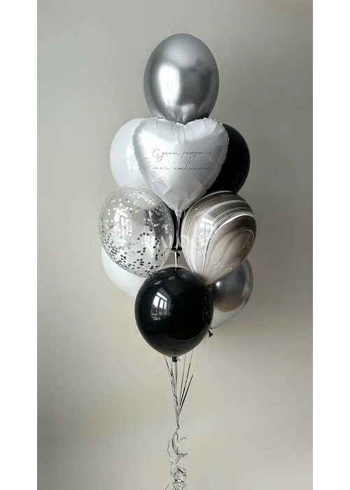 * Связка из латексных гелиевых шаров с добавлением фольгированного гелиевого шара в виде сердца с надписью.
