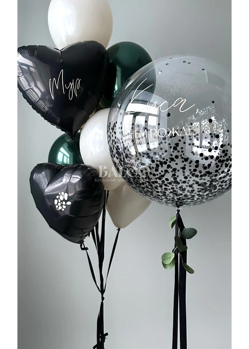 * Связка из 6 латексных гелиевых шаров с добавлением двух фольгированных сердец с надписью