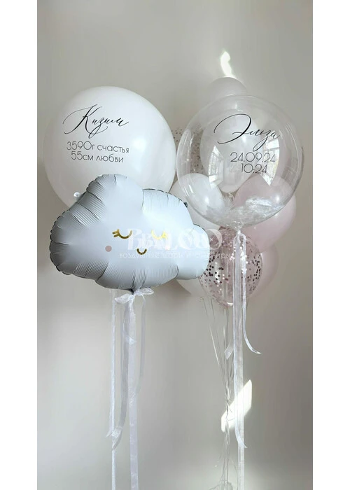 Состав набора -Баблс с перьями -Большой шар с надписью -Связка из 10 шаров -Облако