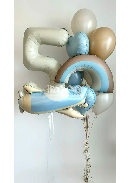 Состав набора: Фольгированная фигура Самолет Фольгированная фигура Радуга Связка из 5 латексных шаров и 2х сердец Цифра