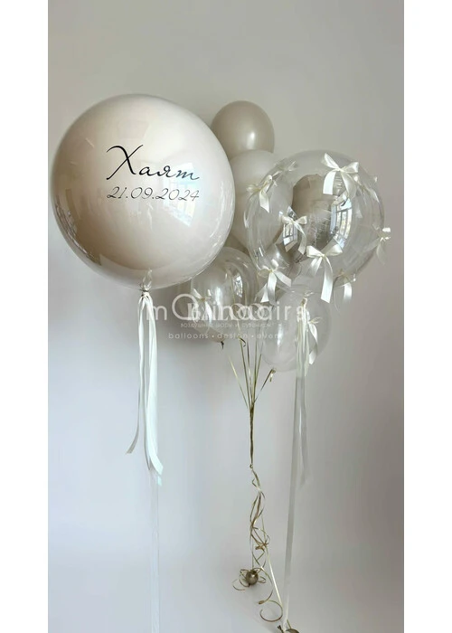 Состав набора -Баблс с бантиками -Связка из 10 шаров с бантиками -Стеклянный шар с надписью