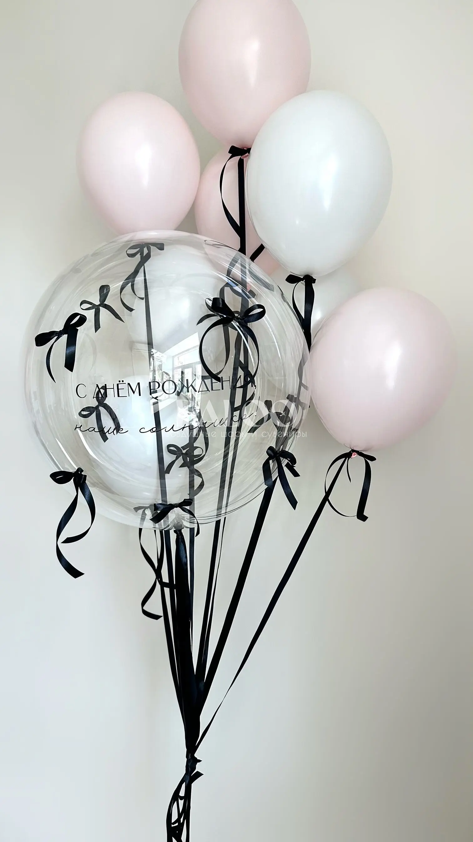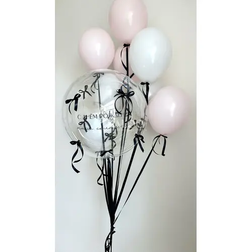 Связка из 9 латексныз шаров и баблс сбантиками и надписью