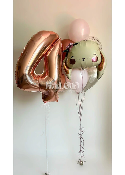 - Связка из 4 латексных гелиевых шаров с добавлением фольгированного сердца и фольгированной фигуры "Зайка"