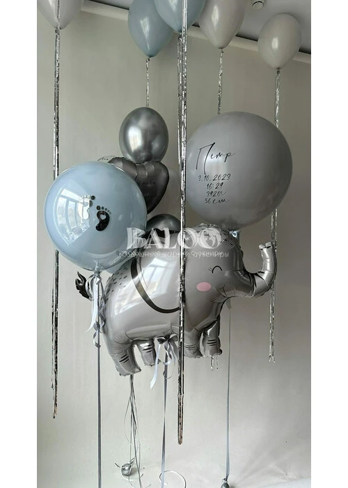 Набор шаров на выписку мальчика со слоником в голубом и серебряном цвете №3221