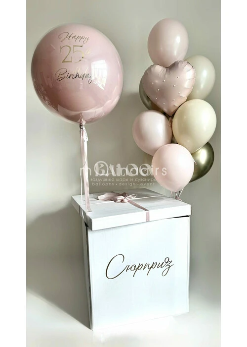 Состав набора: -Коробка сюрприз с надписью -Латексный гелиевый шар 24 дюйма даблбабл с надписью -Связка из 9 латексных шаров и сердца с жемчужинками *фактическая стоимость может отличаться от стоимости, указанной на сайте. Уточняйте стоимость у наших менеджеров! Цвет шаров вживую может немного отличаться от цветопередачи на экране.