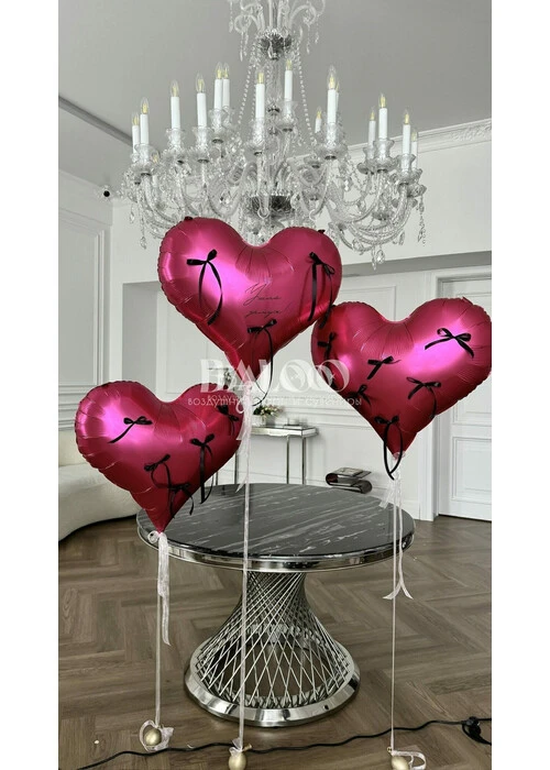 - Три фольгированных гелиевых шара сердца (одно сердце с надписью) с бантиками на грузиках