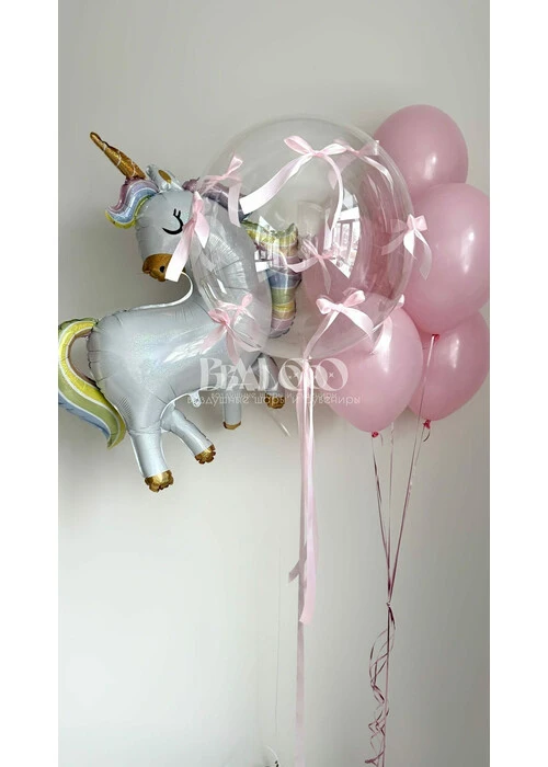 Состав набора: Латексный гелиевый шар 24 дюйма бабл с бантиками Фольгированная фигура Единорог Связка из воздушных шаров 7 шт латексные