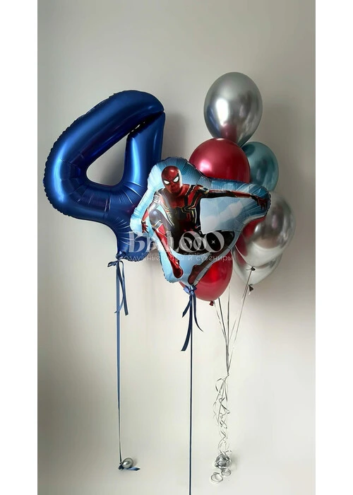 В состав набора гелиевых шаров на день рождение входит:* Связка из 6 латексных шаров.* Фольгированная гелиевая фигура Человека паука* Фольгированная гелиевая цифра 4