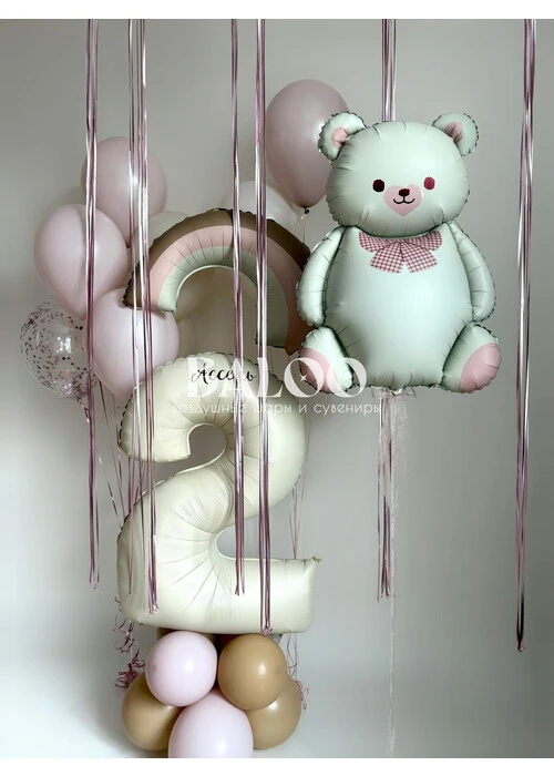 Состав набора: Фольгированная фигура Мишка Фольгированная фигура Радуга 2 связки из воздушных шаров 7 шт Цифра на подставке 6 шаров на сатиновом дождике под потолок