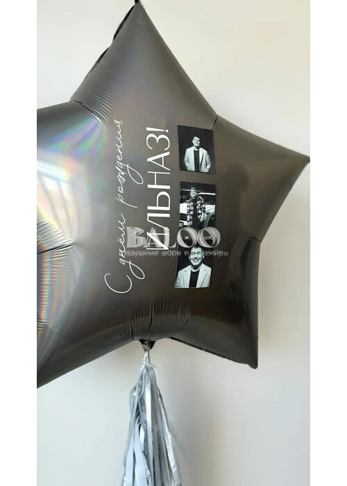 - Фольгированный гелиевый шар в виде серебряной звезды с индивидуальной фотопечатью и надписью с дождиком