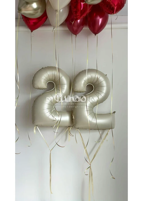 Состав набора: 2 цифры фольгированные 102см 7 латексных шаров под потолок на ленте 3 фольгированныз сердца под потолок на ленте