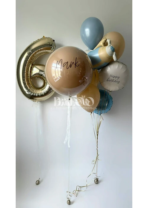 - Связка из 6 латексных гелиевых шаров, фольгированной фигуры "Самолет" и двух фольгированных кругов (один с надписью)*