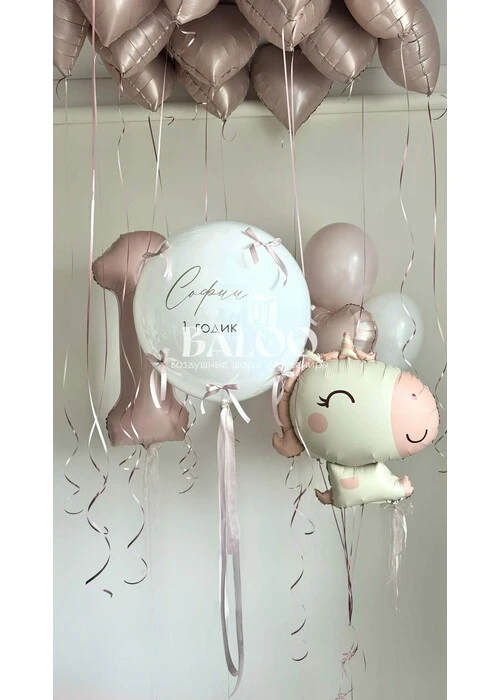 Состав набора: Латексный гелиевый шар 24 дюйма даблбабл с бантиками и надписью Фольгированная фигура Единорог Фольгированные сердца под потолок 13 шт Связка из 3 латексных воздушных шаров и одного сердца Цифра