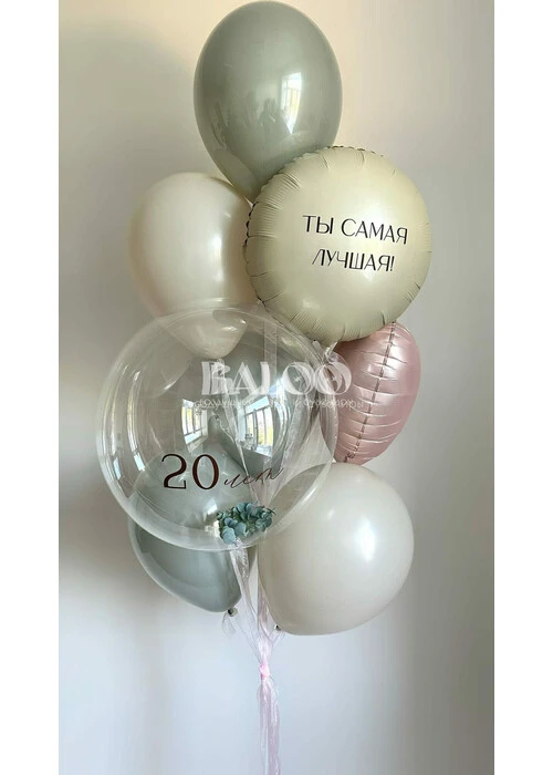 - Связка из 9 шаров: шар бабл с зеленью и надписью, 3 дабл-шара, 3 латексных шара, фольгированный круг с надписью, фольгированное сердце