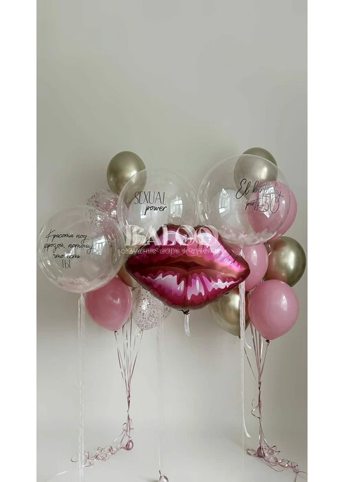 Состав набора: Латексный гелиевый шар 24 дюйма баблс с перьями и надписью 3шт Фольгированная фигура Губы Связка из 10 латексных гелиевых шаров (4 обычных, 3 с конфетти и 3 хром) 2шт