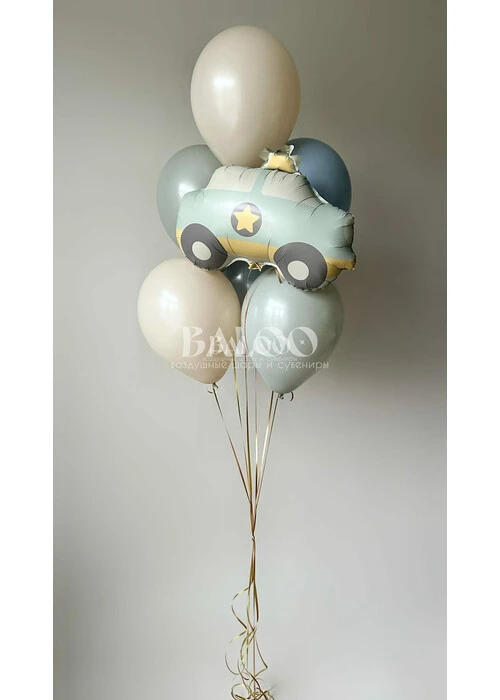 - Связка из 6 латексных гелиевых шаров с добавлением фольгированной гелиевой фигуры машинки