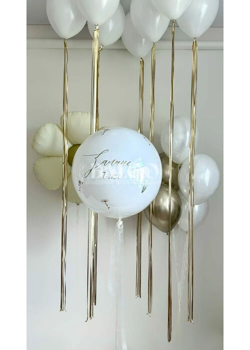 Состав набора: Латексный гелиевый шар 24 дюйма даблбабл с наклейками и надписью Фольгированная фигура Ромашка Связка из воздушных шаров 5 шт Латексные гелиевые шары под потолок на сатиновом дождике 7 шт
