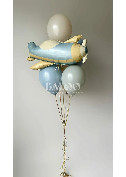 - Связка из 6 латексных гелиевых шаров с добавлением фольгированной гелиевой фигуры самолетика