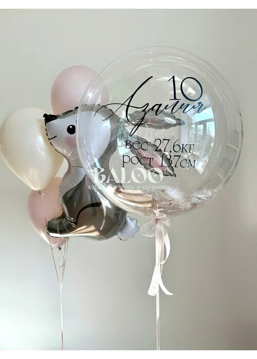 Состав набора: Латексный гелиевый шар 24 дюйма бабл с перьями и надписью Фольгированная фигура Зайчик Связка из 4 шаров