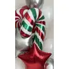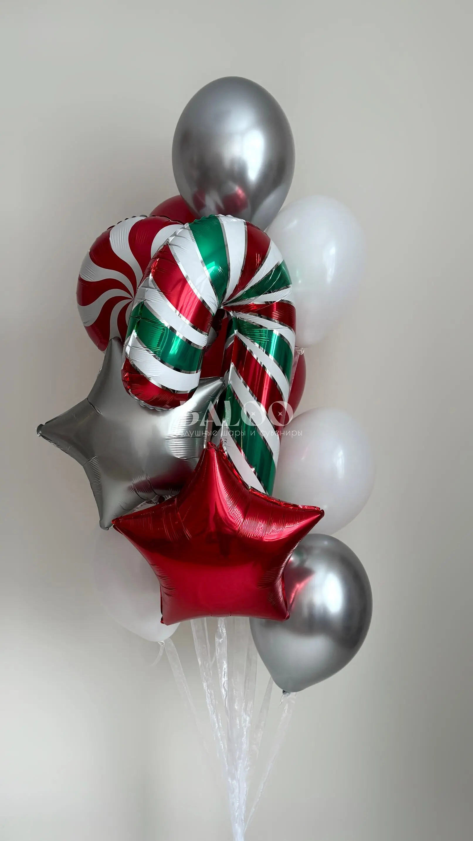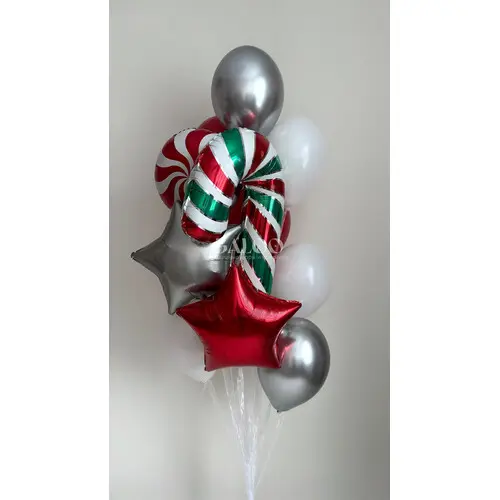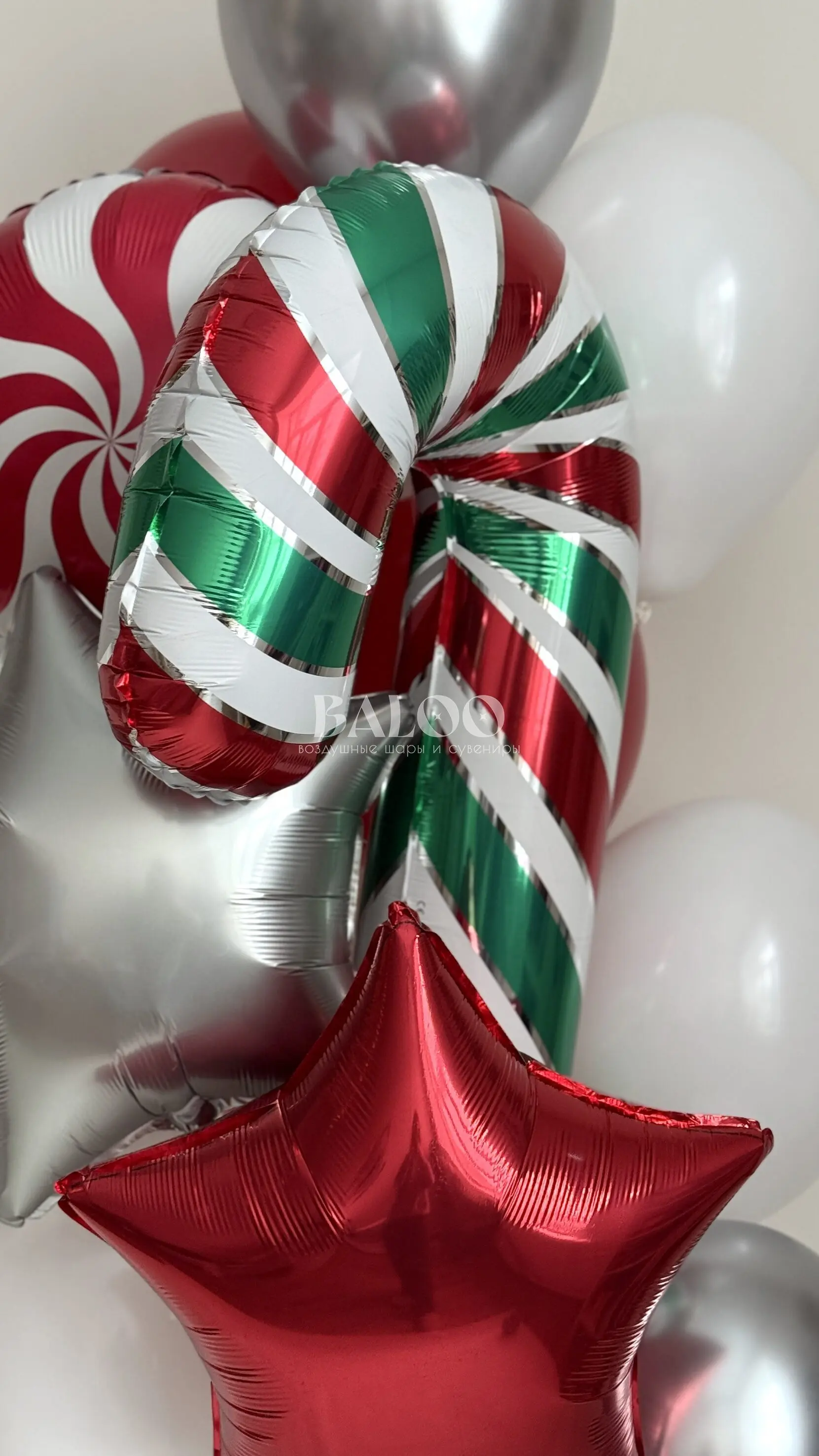 - Разнокалиберная связка из 8 латексных шаров, фольгированной фигуры карамель палочка, фольгированной фигуры круг карамель, двух фольгированных звезд