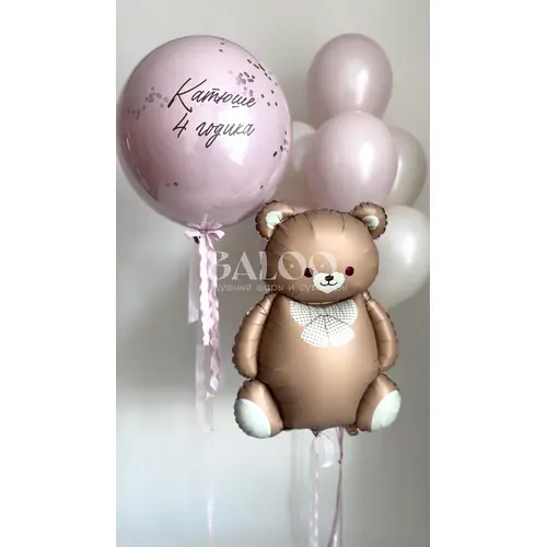 Набор гелиевых шаров пудрового цвета с мишкой №132