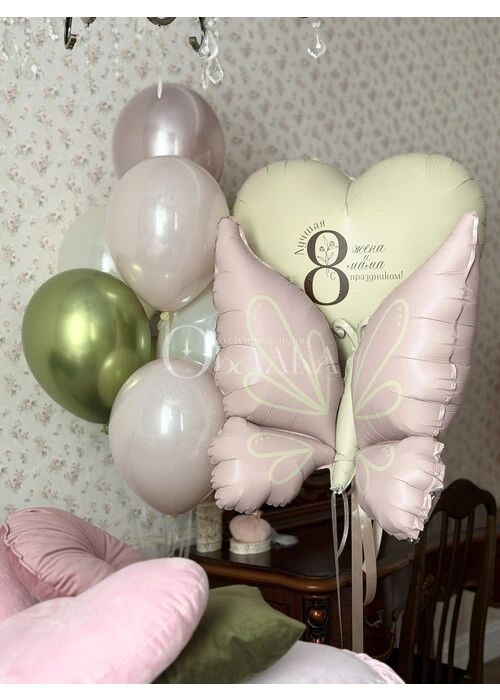 Идеальный набор для тех, кто хочет подарить и любовь (сердце), и лёгкость (бабочка), и праздник (связка шаров). Сердце с персональной надписью станет главным посланием, бабочка добавит воздушности, а связка шаров создаст объём. Композиция подойдёт как для взрослой женщины, так и для девочки. Шары наполнены гелием, бабочка также летает. Можно выбрать любые цвета и тексты.